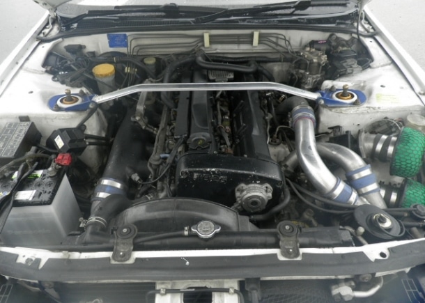 The twin-turbo 2.6-liter engine of a 1993 Nissan Skyline GT-R (R32) exported by Japan Car DirectThe twin-turbocharged DOHC 2.6-liter inline-six RB26DETT engine, with cast iron engine block and aluminum alloy cylinder head, is full of advanced features including three pairs of throttles for intake and water-cooled ceramic turbos. Nissan only published horsepower figures up to 280 PS, but many claim the output is closer to 320 PS.